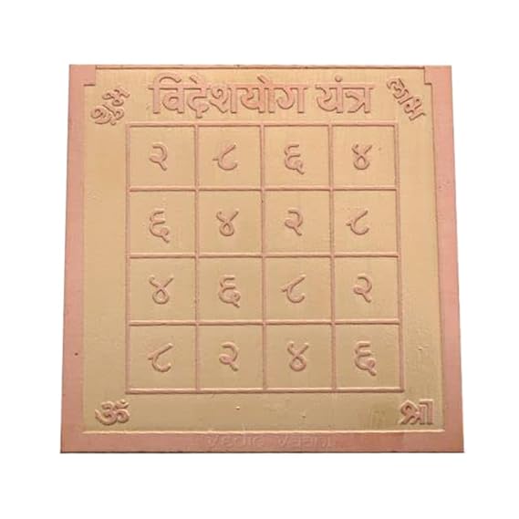 Unlock your global aspirations with the Videsh YOG Yantra by Vishakha Arts, specially designed to enhance your chances of traveling, studying, or working abroad. This 1.5 x 1.5-inch thick copper yantra is handcrafted and energized through traditional rituals, ensuring it radiates potent vibrations that align planetary energies in your favor. Perfect for those seeking international opportunities, this yantra serves as a powerful spiritual tool for overcoming obstacles related to Videsh YOG (overseas prospects). Its compact size makes it easy to carry in your pocket, purse, or wallet, ensuring its positive energy is always with you. Whether used for daily meditation, placed in your altar, or kept close during travels, the Videsh YOG Yantra ensures balance and clarity while helping you achieve your dreams. Care Instructions: Clean with a soft, dry cloth to maintain its shine and spiritual effectiveness.